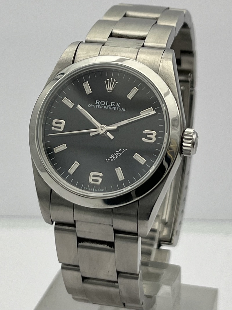 OYSTER PERPETUAL : 2 des mots les plus anciens dans l'univers Rolex, 2 mots qu'on a tant vu qu'on ne les lis plus. 2 mots qui résument toute la philosophie de Rolex : Oyster pour le boîtier aussi étanche qu'une huitre, et Perpetual car le mouvement automatique rend son fonctionnement automatique tant qu'elle est portée. Avec 5mm de plus, cette montre s'appellerait EXPLORER : la montre de la gamme professionnelle Rolex, reconnaissable par son 3 - 6 - 9 lisible en toute circonstance. Comment ne pas reconnaître le clin d'oeil à sa grande soeur !