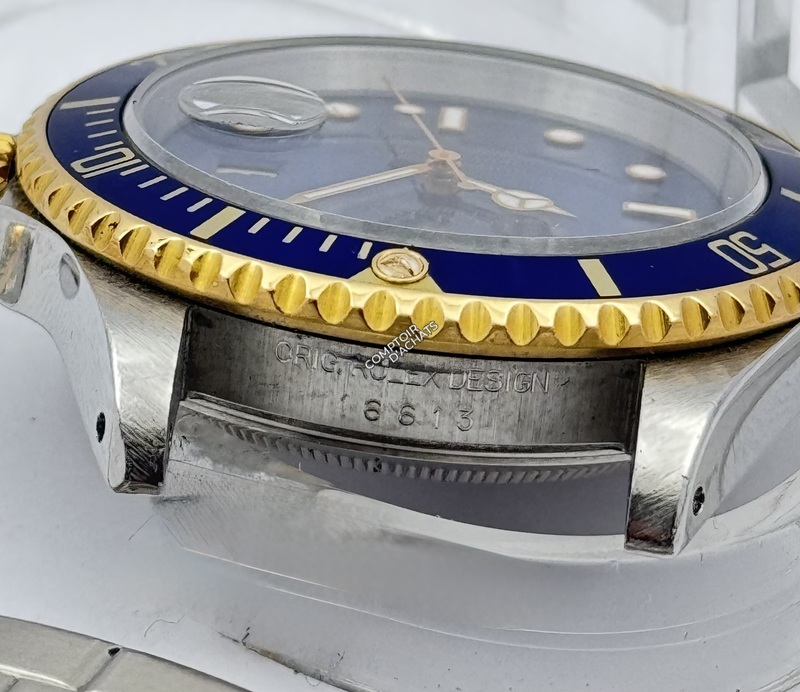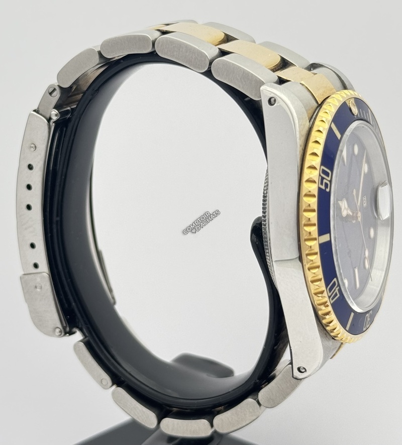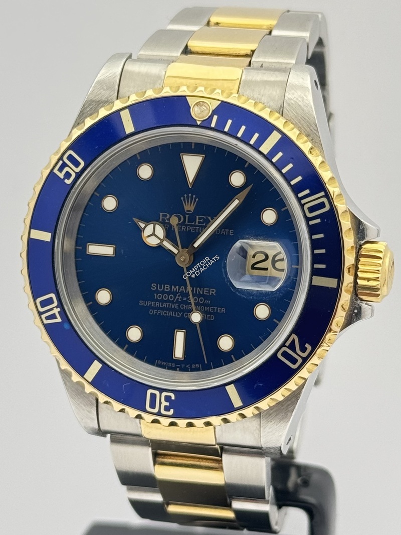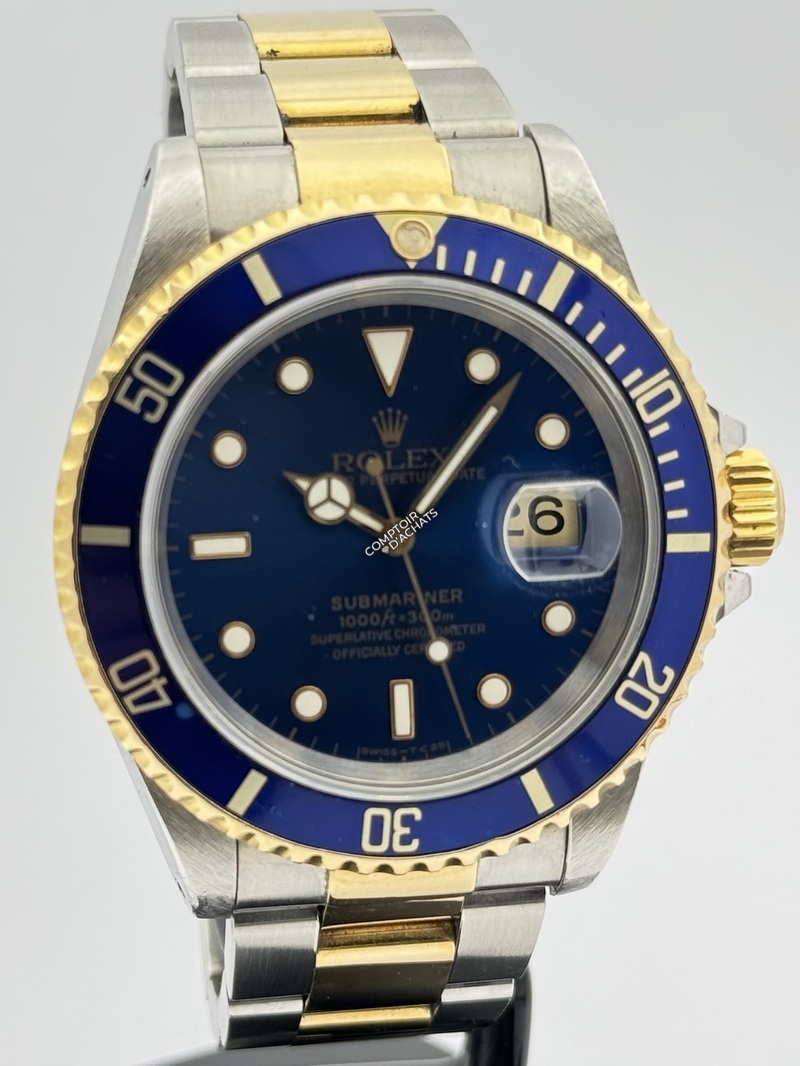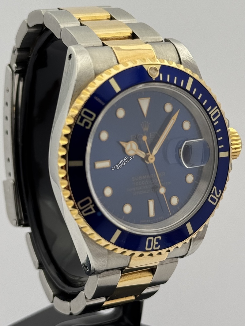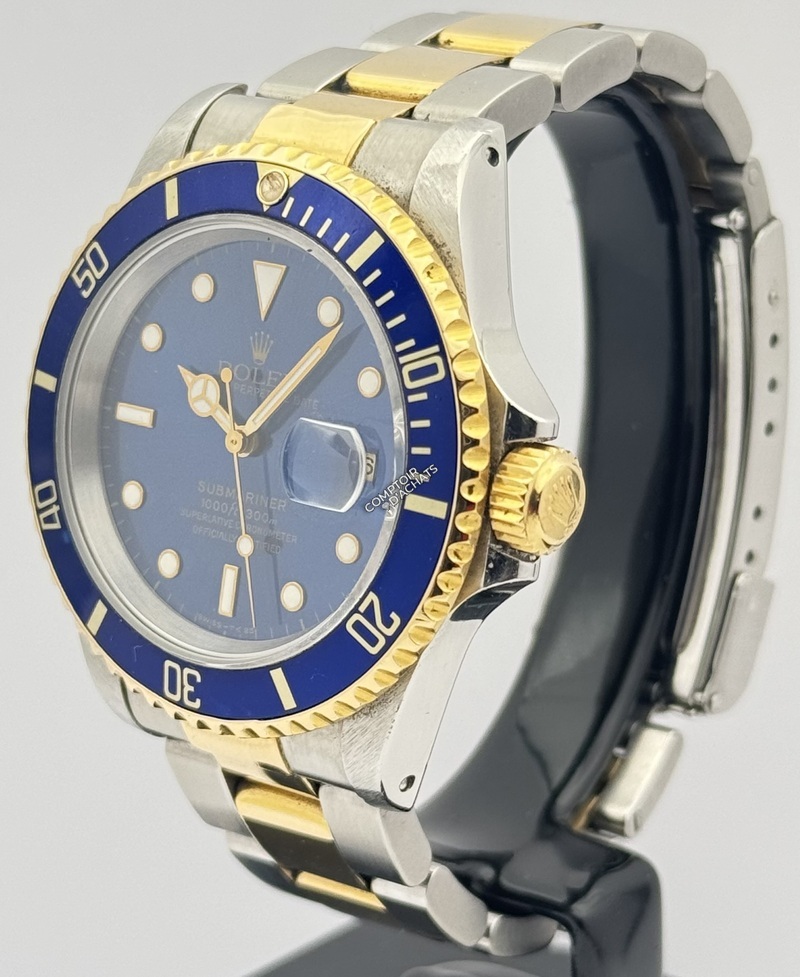 Cette montre est une Rolex Submariner Date, référence 16613 LB, souvent surnommée "Bluesy" par les collectionneurs. Série S