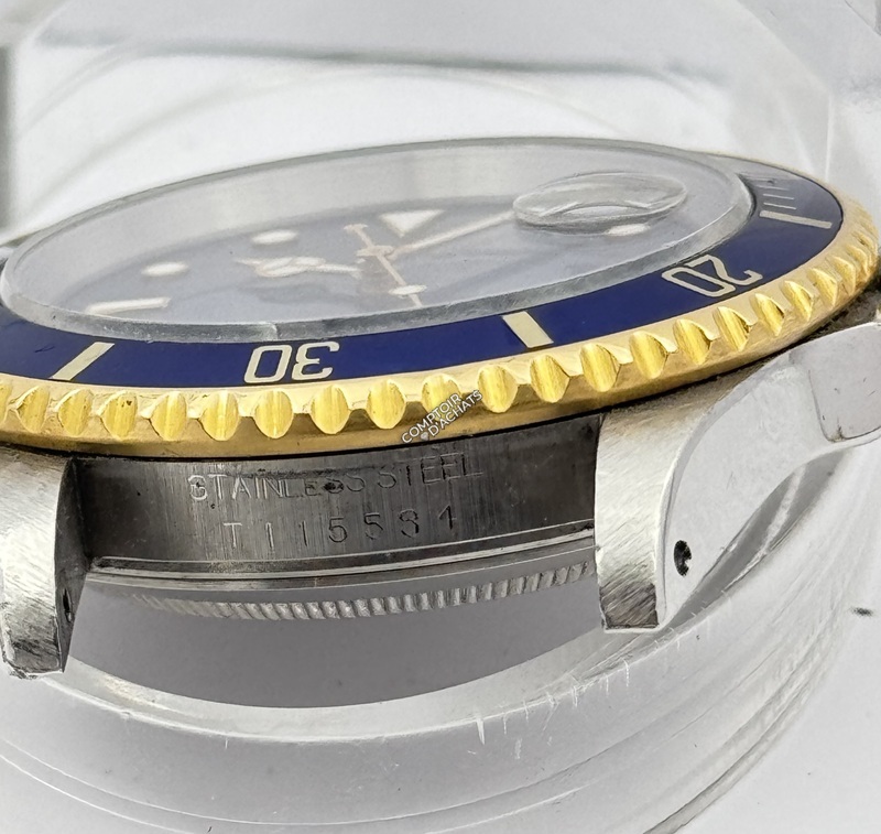 Index : Cerclés d'or jaune. À noter la mention "SWISS-T<25" à 6 heures, ce qui indique que les index utilisent du tritium comme matière luminescente (typique des modèles produits avant la fin des années 90).