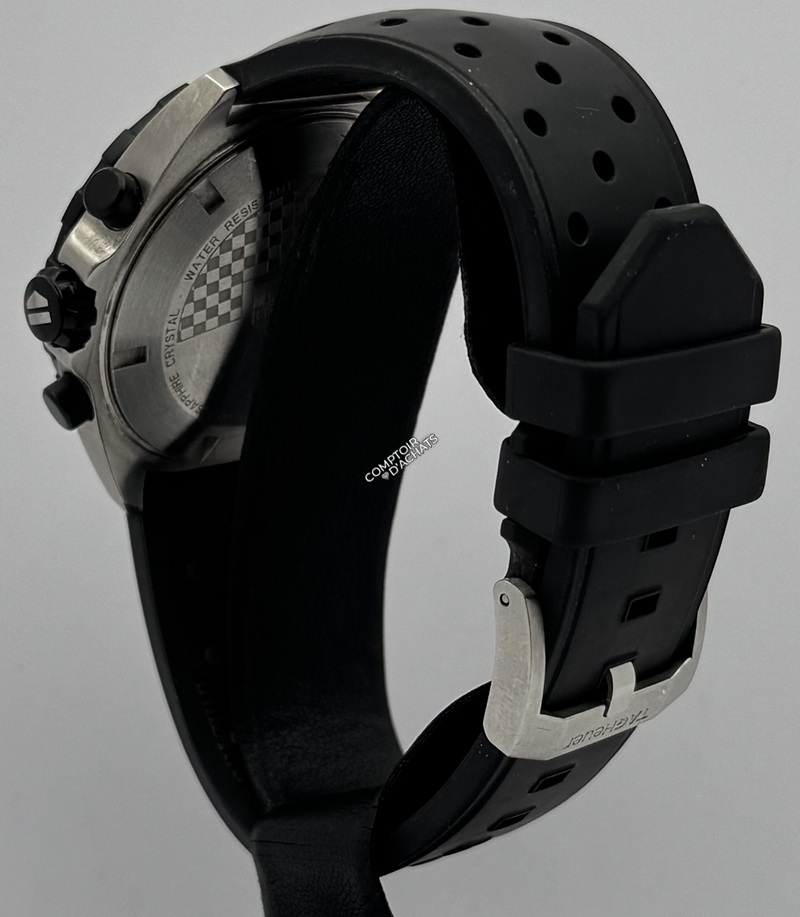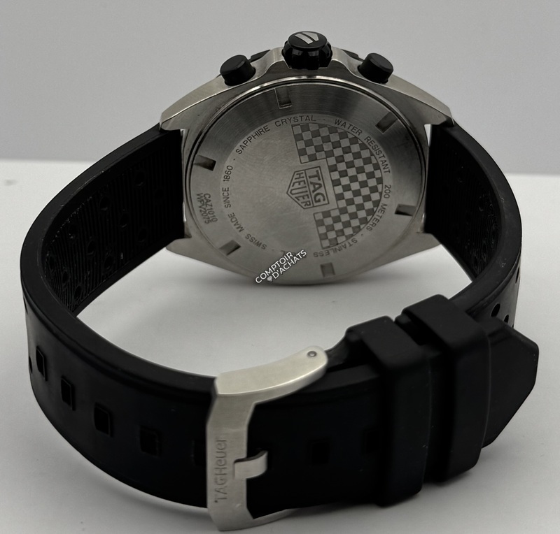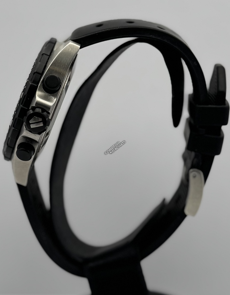 Le cadran noir comporte trois compteurs de chronographe (1/10e de seconde, minutes et secondes courantes) et est protégé par un verre saphir inrayable.
