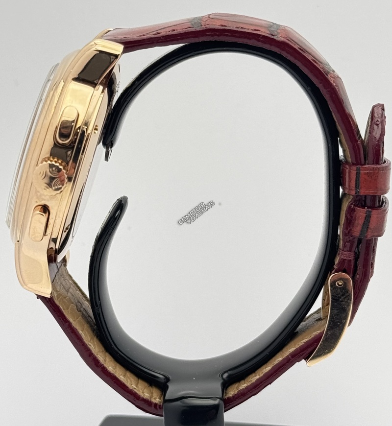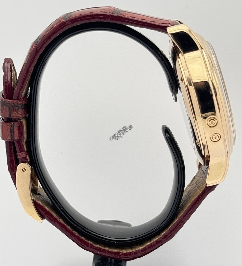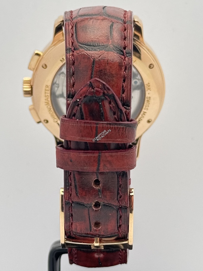 Fonctions "Grand Complication" : En plus du chronographe, elle affiche le jour, le mois, la date et une élégante phase de lune à 6 heures.
