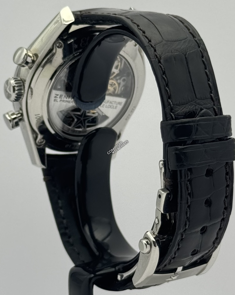 Au coeur de cette pièce bat le célèbre Calibre El Primero 400, manufacture Zenith, visible à travers le fond de boîtier saphir :