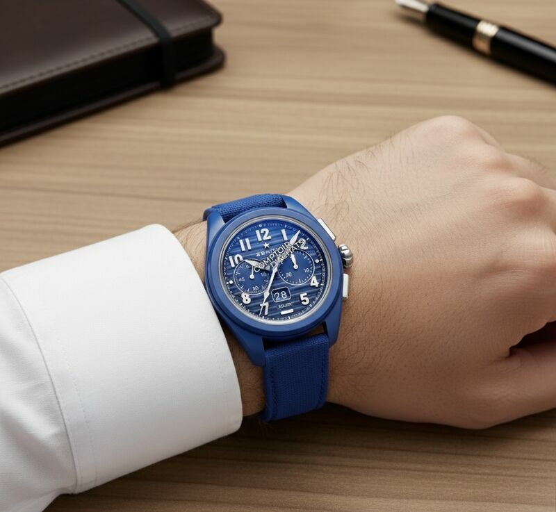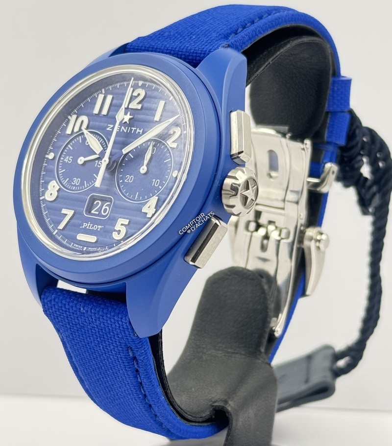 Célébrez l'héritage aéronautique de Zenith avec cette édition exclusive créée pour le 160e anniversaire de la Manufacture. Ce modèle se distingue par son boîtier en céramique bleue et son cadran texturé, offrant une allure moderne et technique à l'emblématique montre d'aviateur.