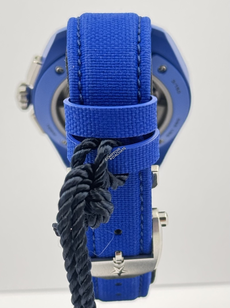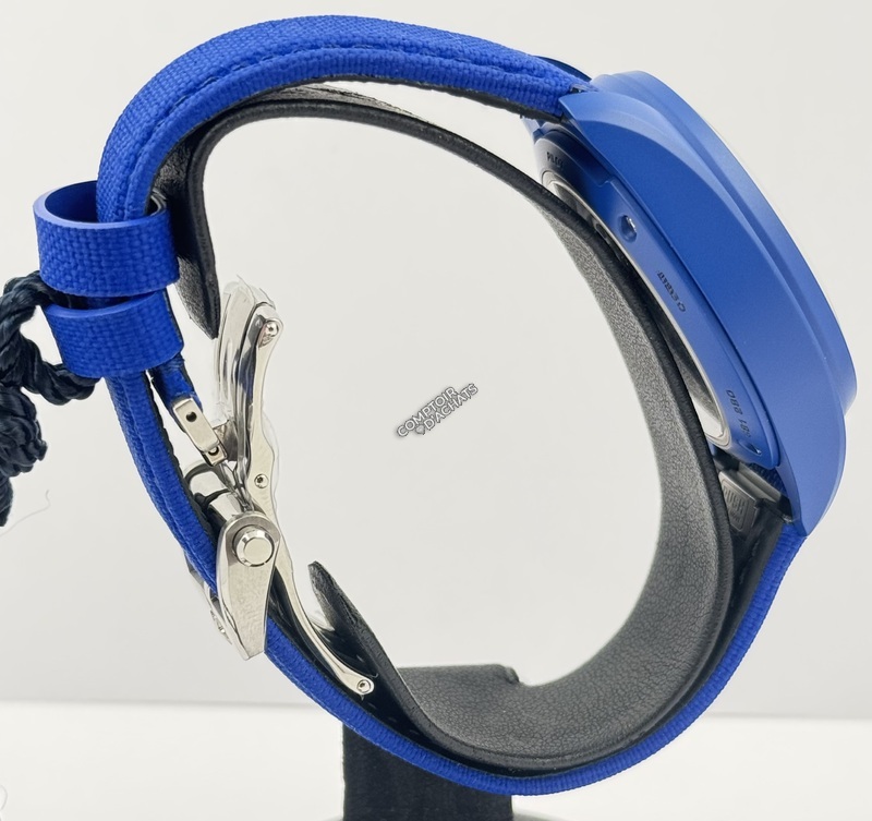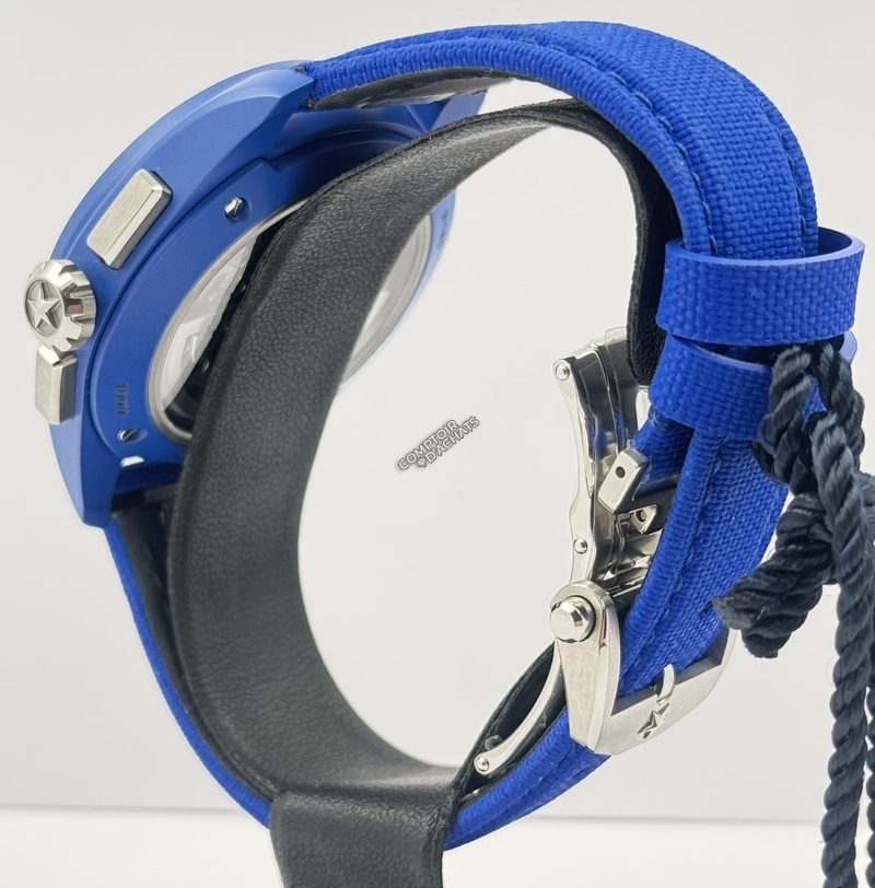 Boîtier : 42 mm en céramique bleue microbillée, avec couronne et poussoirs "pump" en titane.