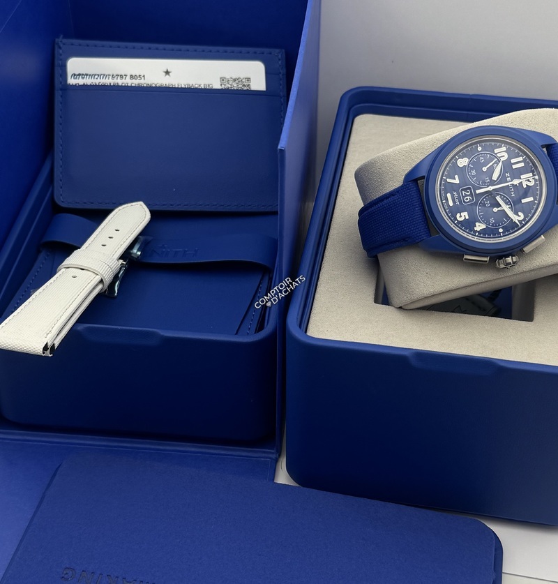 Contenu du Set (Full Set Complet) : Montre Zenith Pilot (Édition limitée 1/160). Les deux bracelets d'origine (Bleu et Blanc). Écrin spécial 160e Anniversaire. Carte de garantie internationale Zenith datée de 2026.